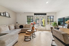 De sfeervolle living van deze woning heeft een oppervlakte van circa 33m² en geniet van veel natuurlijk licht dankzij de grote ramen aan de achterzijde. Ook bevindt zich hier de trapopgang naar de eerste verdieping. De begane grond is in 2023 voorzien van een stijlvolle houten visgraat PVC-vloer én vloerverwarming.